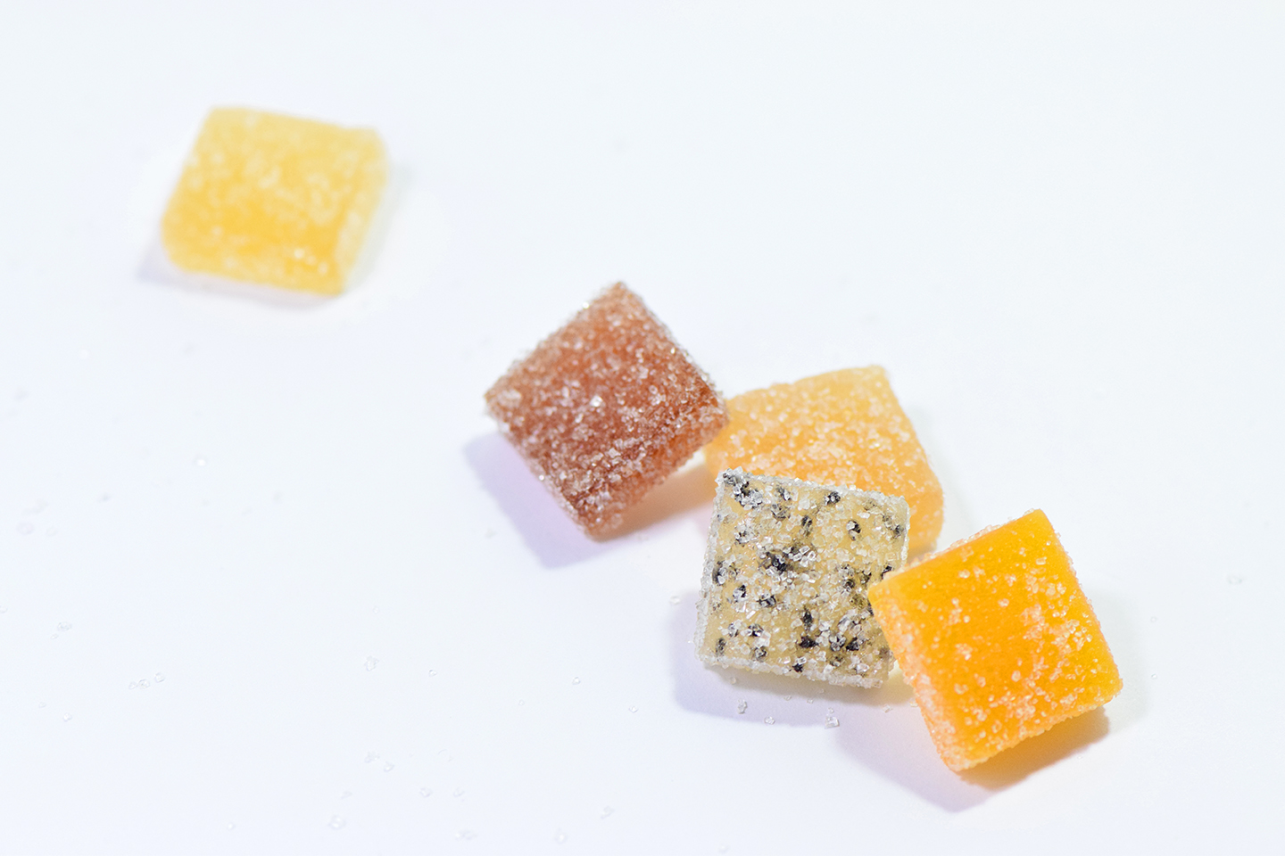 而有別於一般市售由動物膠(明膠)凝固成型、帶有嚼勁口感的軟糖,有著明顯的差異。